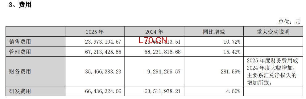 年报显示,英力股份2025年销售费用、财务费用、管理费用、研发费用均有不同程度增长。其中,2025年度财务费用较2024年度大幅增加281.59%,主要系汇兑净损失的增加所致。