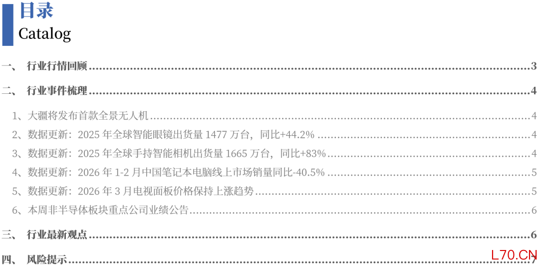 行业行情回顾:非半导体领域,2026/3/23-27光学、品牌消费电子实现上涨,LED、PCB板块下跌较多。估值方面,LED、光学元件PE-TTM较高,面板、品牌消费电子PE-TTM较低。个股方面,本周涨幅前五的有杰美特、奥瑞德、腾景科技、百邦科技,跌幅靠前的深华发A、三安光电等。