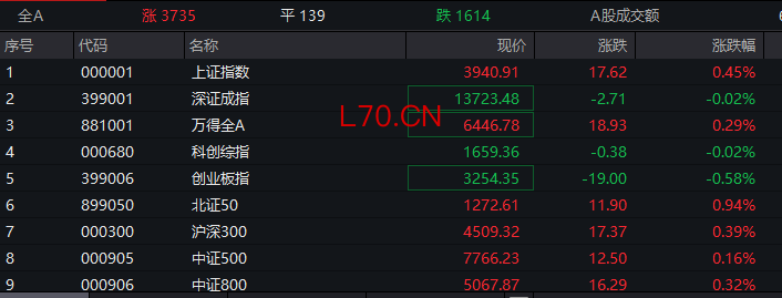 A股整体上涨,全市场超3700股飘红。指数方面,上证指数涨0.45%,北证50指数涨近1%。