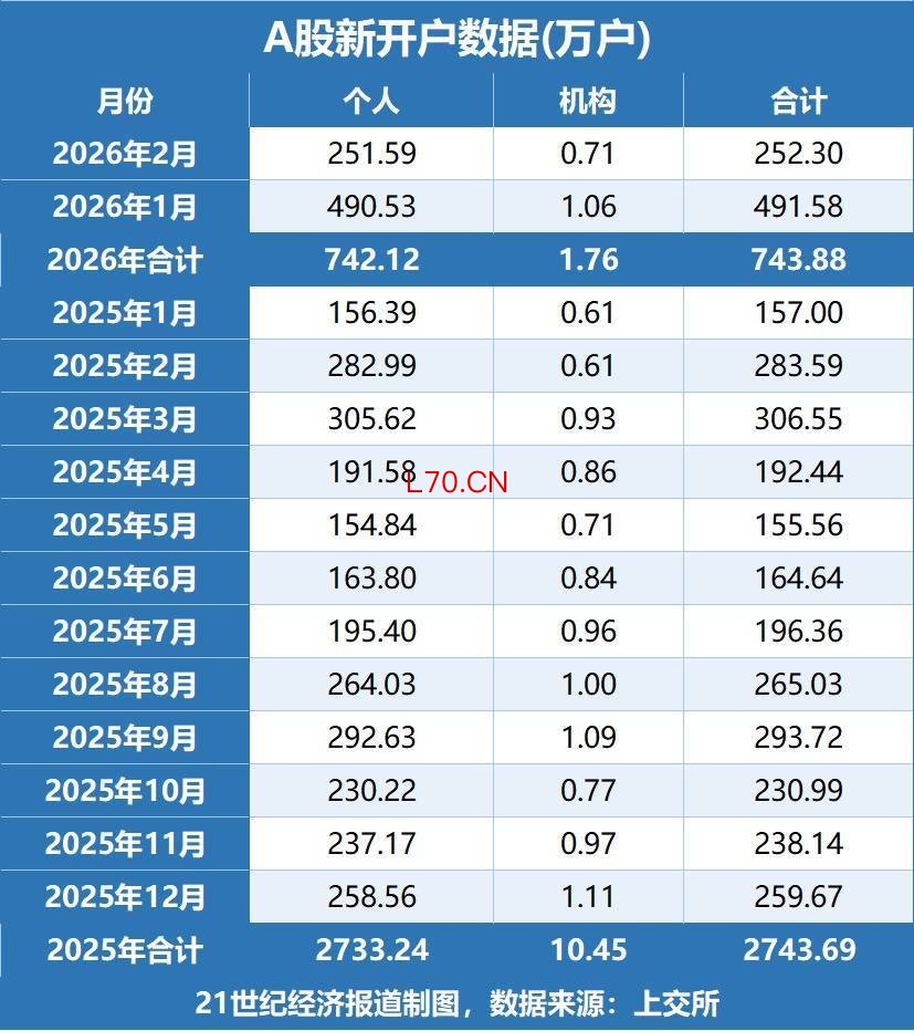 日均开户数高达18万户3月3日,上交所最新披露数据显示,今年2月投资者新开A股账户达252.3万户。其中,2月个人新增开户251.59万户,机构新增开户0.71万户。