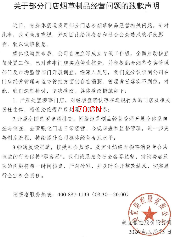 美宜佳就部分门店被曝卖假烟致歉:严处涉事门店,开展专项排查