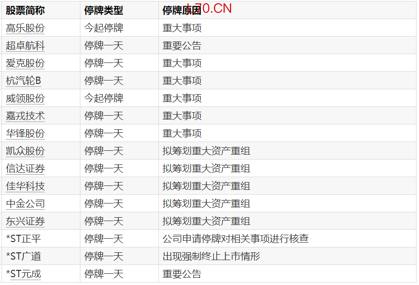 A股停牌提示:15股今日停牌